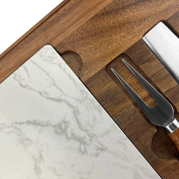 Luxury style wooden cheese board knife set with white marble slate which can be removed for cleaning and additional space.