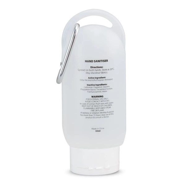 Gel hand sanitiser in a convenient tube with a no-mess flip cap and a carabiner clip. It has ingredients information on the back of the tube.