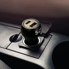 Handy car charger with dual charging ports and a built-in safety hammer for emergencies. Gideon can charge two devices simultaneously via a USB-A port and a Type-C port.