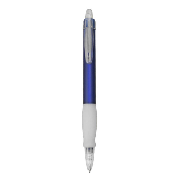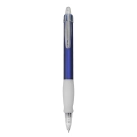 Push action plastic pen with white rubber grip and clear transparent tip and clip frosted translucent barrel high quality German manufactured black ink refill 1800 meters writing distance tungsten carbide ball provides you with quality writing.