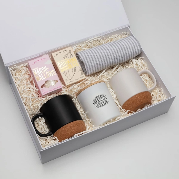 Soft light, savoury bites – the perfect pairing in one sleek gift. Lift open the white magnetic-close box and you’re greeted with a mix of warm ambience and relaxed entertaining. A smooth acacia serving board with satin gold knives sets the scene for easy grazing, while the softly glowing candle adds instant calm. Finished with a classic cotton tea towel, Glow & Graze is the kind of gift that feels thoughtful, versatile, and ready to impress. What’s Inside? 1 x Gabel & Teller Acacia Serving Board: A premium wooden board that makes a thoughtful and practical gift for any occasion, 1 x Gabel & Teller Luxe Gold Cheese Knife Duo: A simple, stylish pair that feels satisfying to hold and use. 1 × Gleam glass candle (Large LL3035) – choose black or white with a natural bamboo lid; soft vanilla scent. 1 × Classic cotton Nicole Spring tea towel – light grey pinstripe, 70 × 50cm. Presented in a white magnetic-close gift box with vanilla cream shred.
