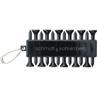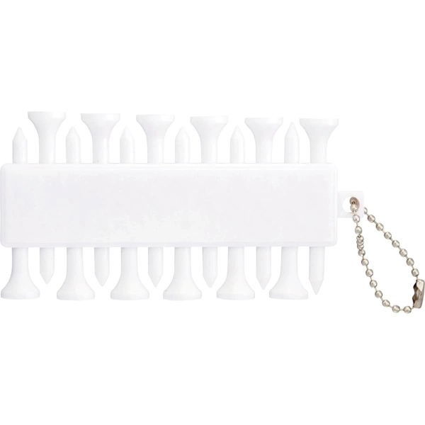 12 golf ball tees and 3 golf ball markers on beaded chain.