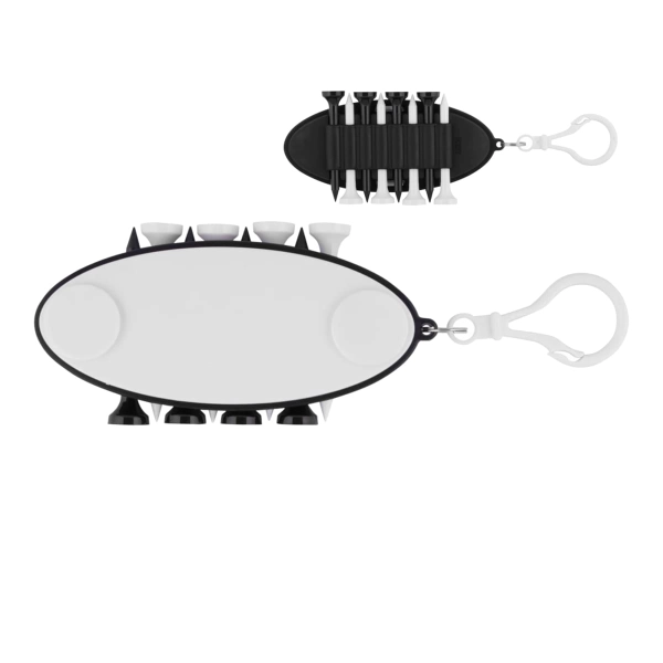 Durable ABS plastic case holding eight golf tees made from PS plastic two round white ball markers and a plastic clip to attach the set to a belt loop golf bag or even a set of keys. The perfect pack for every golfer.