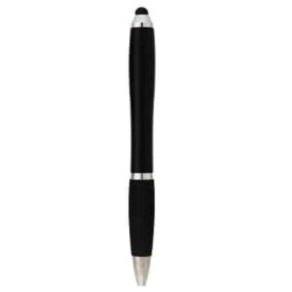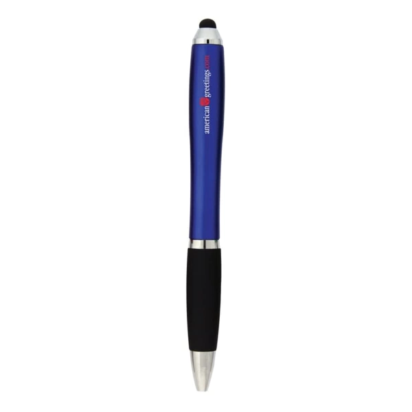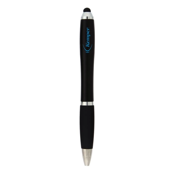 A dual-purpose plastic twist action pen featuring a soft stylus orb. This pen works great with your mobile device, iPad, tablet, or other tech devices. Enjoy the functionality and convenience this pen will bring. Comes with black ink.