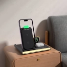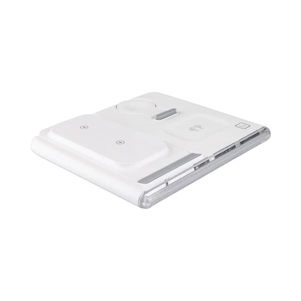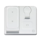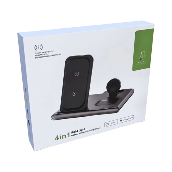 The Haines 15W wireless charging stand is foldable, compact, and convenient on the desk or while travelling. It simultaneously allows for quick and efficient charging of your Qi-compatible phone, TWS earbuds with wireless charging cases, and an iWatch or Samsung Galaxy Watch. The stand supports both portrait and landscape orientations for phone charging and features a switchable LED nightlight. Safety is a top priority with this device, which includes ventilation holes that help reduce heat build-up, foreign object detection, overcurrent protection, and short-circuit prevention. The package includes a Type-C charge cable, a 30W (QC3.0) wall adaptor, and a user manual. Materials: ABS, Acrylic, PC.
