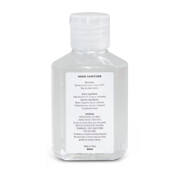 Gel hand sanitiser in a convenient bottle with a no-mess flip cap lid. It has ingredients information on the back of the bottle.