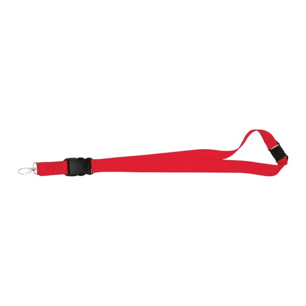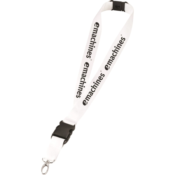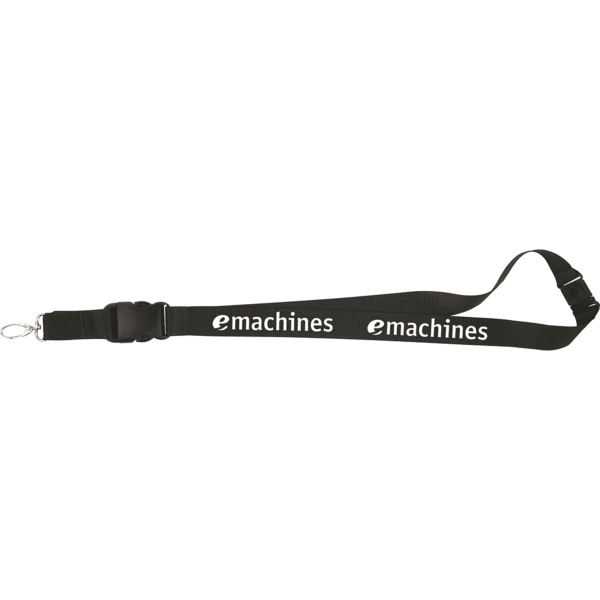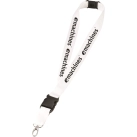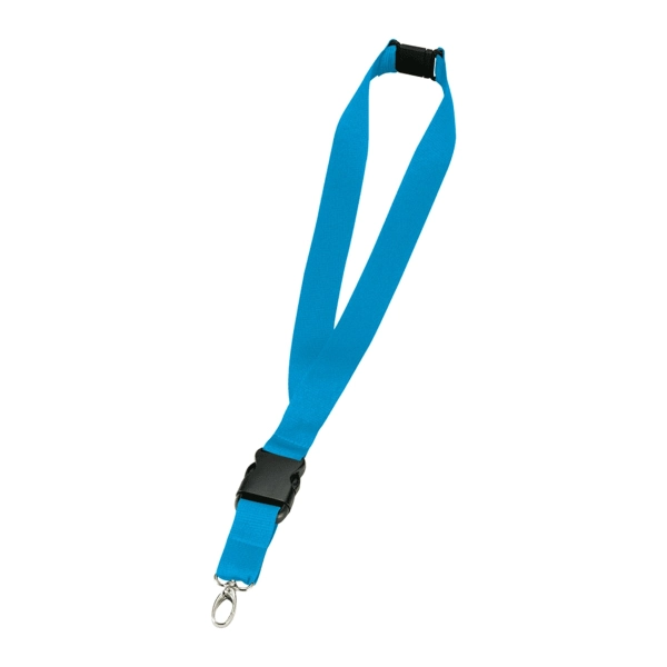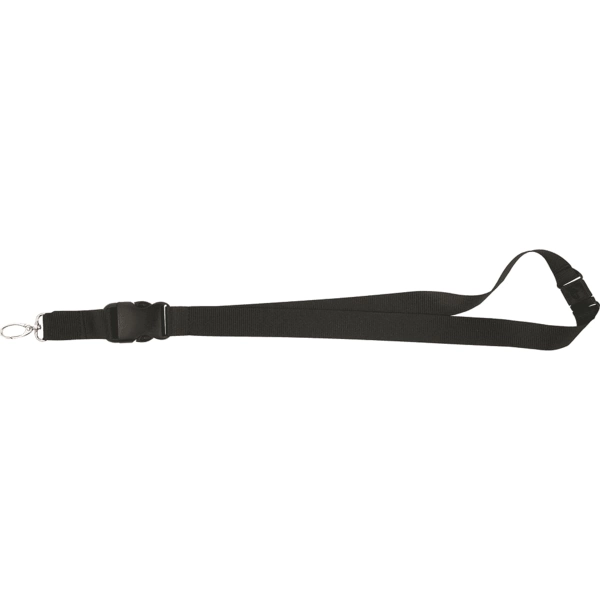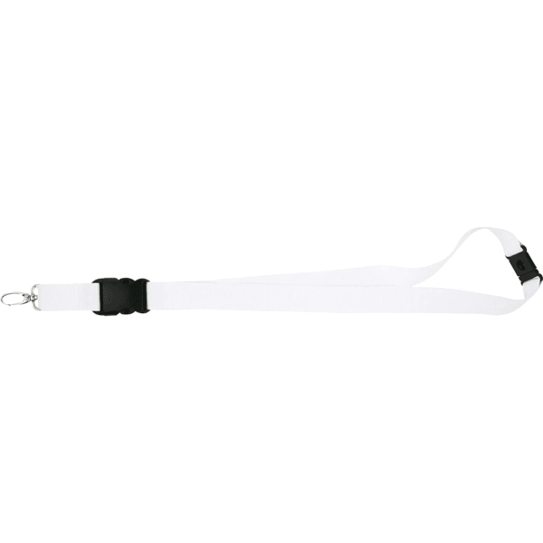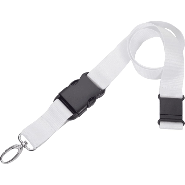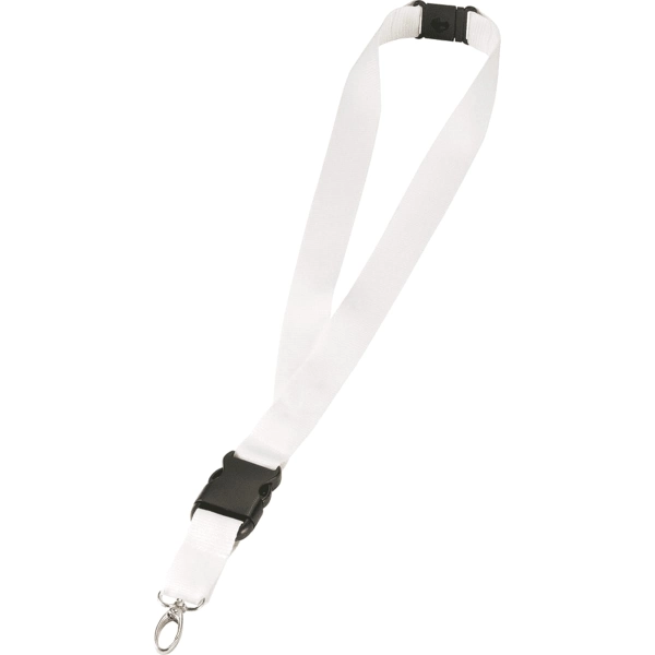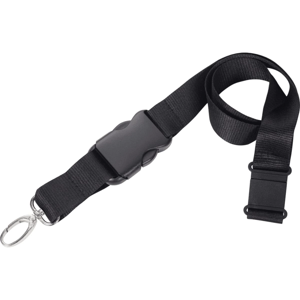These lanyards are 25mm wide and 450mm long. The lanyard includes a breakaway neck clip and detachable plastic clip with wide metal swivel hook.