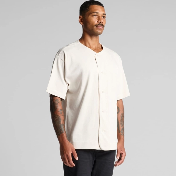 Button up dropped shoulder jersey, wide placket, tonal corozo nut buttons, side seamed, preshrunk to minimise shrinkage