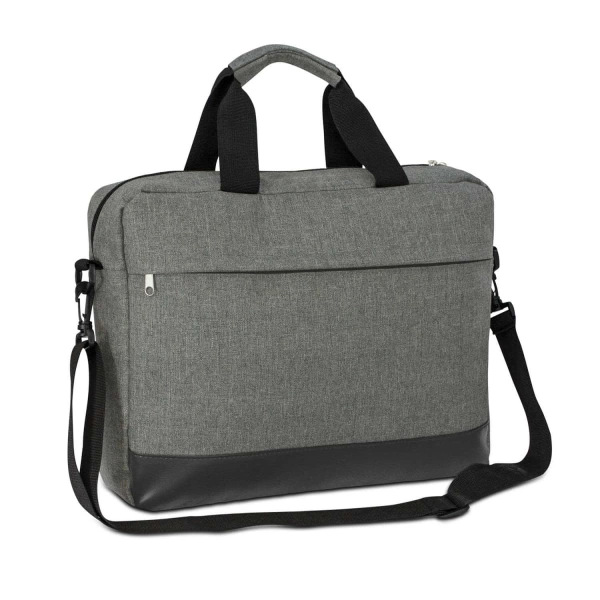 Large padded business or conference satchel which is manufactured from polycanvas with an on-trend heather style finish. It has both carry handles and an adjustable shoulder strap which is removable. Other features include an internal padded compartment that will fit a 15-inch laptop, a large front pocket with a hidden zippered closure and a robust 600D polyester base.
