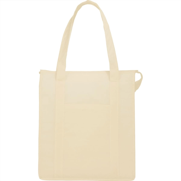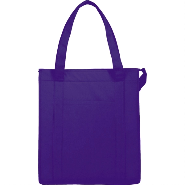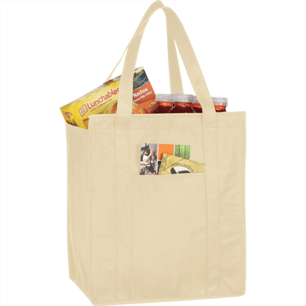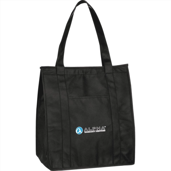 The Hercules Insulated Grocery Tote is as strong as its name suggests and is fully insulated with a heat-sealed water-resistant lining. Its zippered main compartment features a front open pocket, double 23 inch handles and is reusable and a great alternative to plastic bags. Capacity of approximately 29L. Gusset & Handle Decorating does not qualify for one day turn.