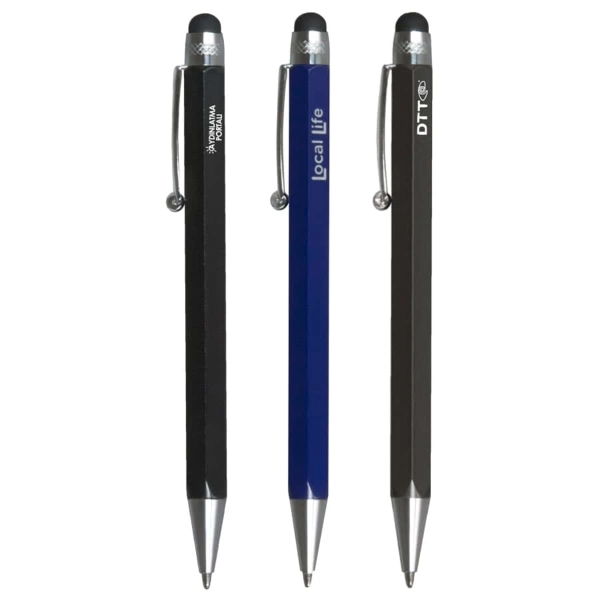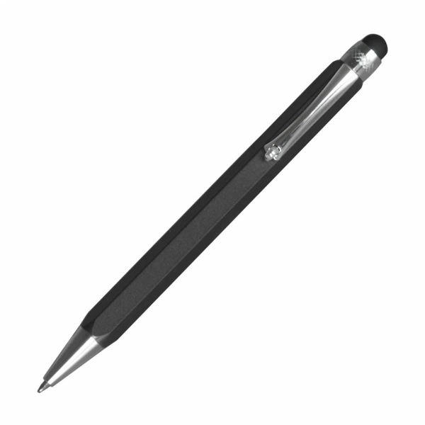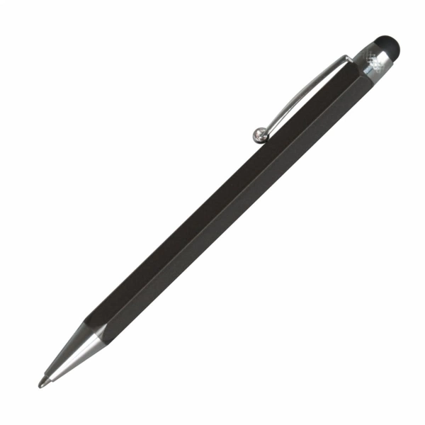 This twist-action aluminium pen features a stylus tip and a distinctive hexagonal barrel for a modern, tactile feel. Fitted with a black Parker-style refill, it delivers a smooth writing experience while offering the added bonus of touchscreen compatibility. A sharp choice with a standout silhouette.