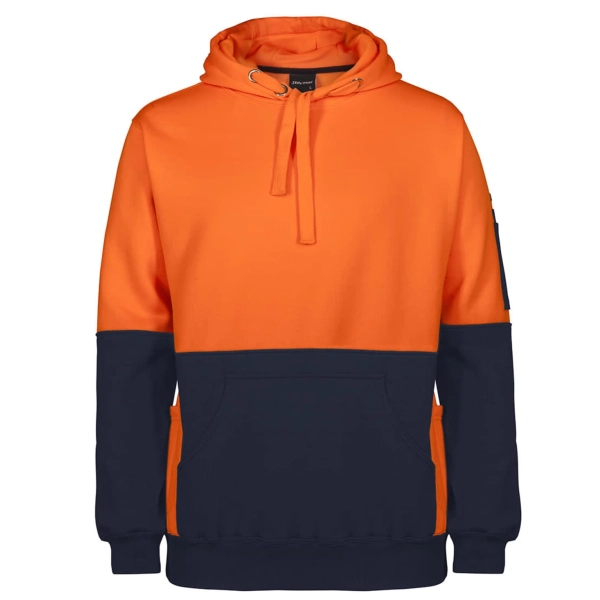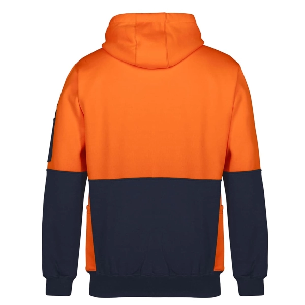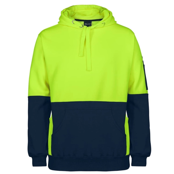 Classic fit | 80% polyester for durability, 20% cotton for comfort - 330gsm | Contrast panel at body and sleeve | Kangaroo pocket at lower front | Sleeve pen pocket | 3 panel hood with drawcord | Complies with AS/NZS 1906.4: 2010 and AS/NZS 4602.1: 2011 Day only | Complies with Standard AS 4399:2020 for UPF Protection (UPF 50+) | Side panel pocket with hook-pile tape closure and pen insert