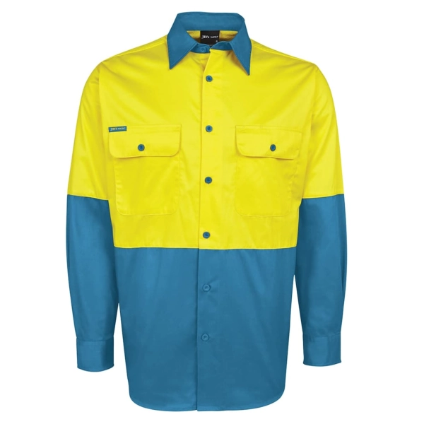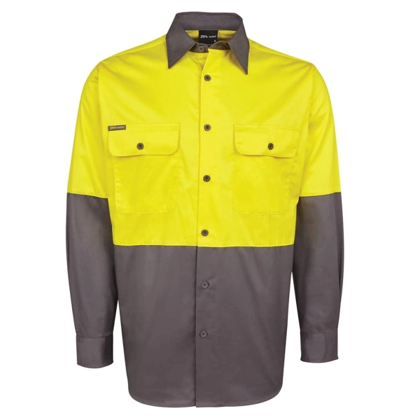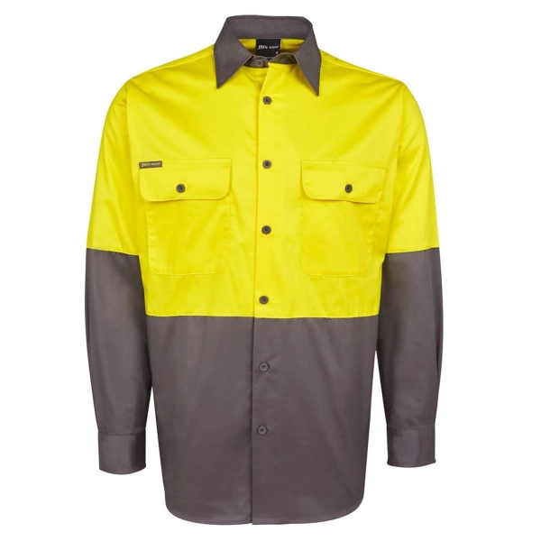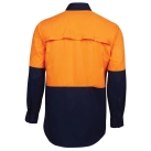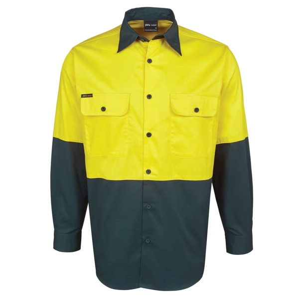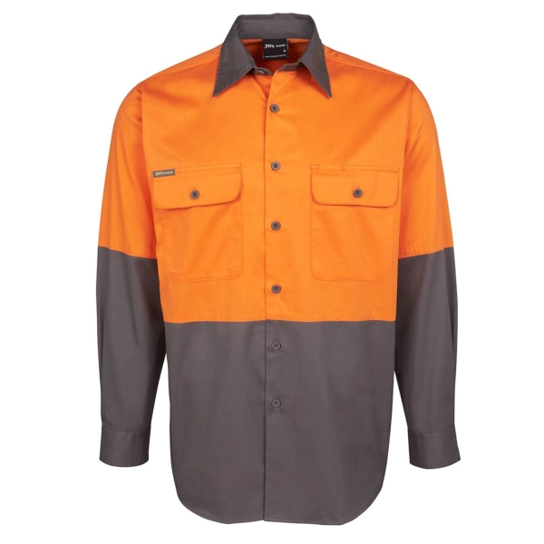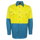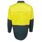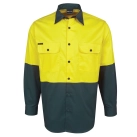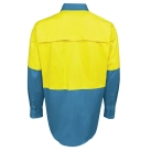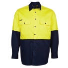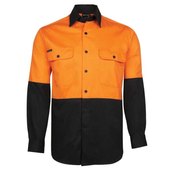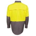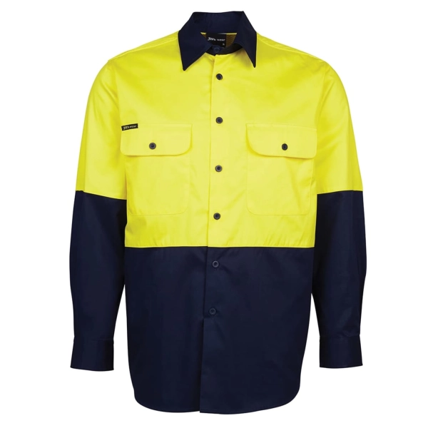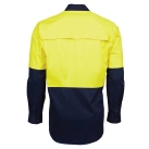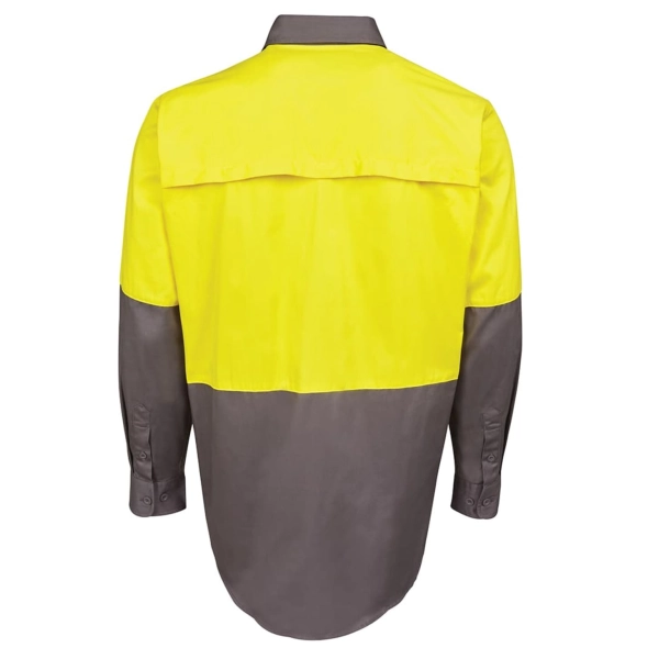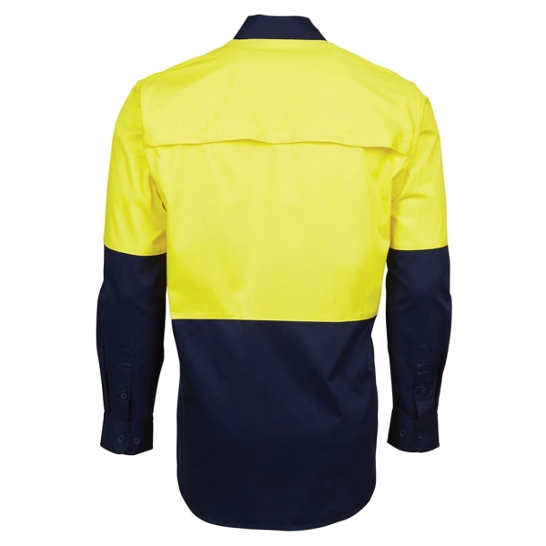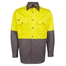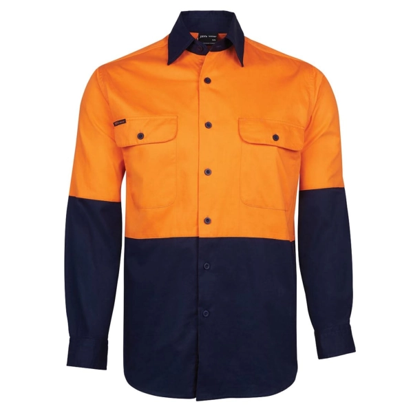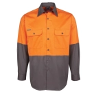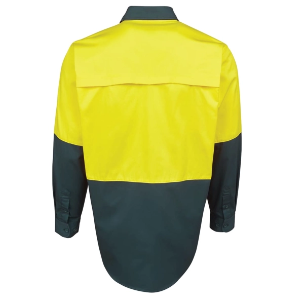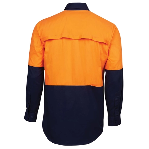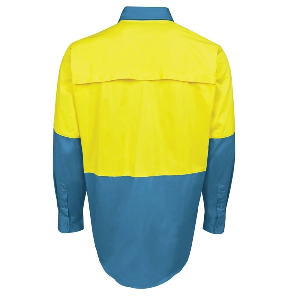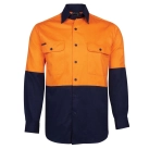 Classic fit | 100% Cotton for 100% comfort in a 150gsm double pre-shrunk drill | Complies with Standard AS 4399:2020 for UPF Protection (UPF 50+) | Complies with Standards AS/NZS 1906.4:2010 and AS/NZS 4602.1:2011 Day Only | Wide back neck yoke with concealed mesh, cooling gussets at underarms | Two front pockets with button-down flaps and pen insert | Contrast panel on front, back, long sleeves and collar | Curved hem with back tail styling | Two-piece collar | 8/9XL only in Orange/Navy, Yellow/Navy, Orange/Black