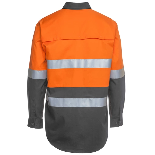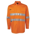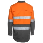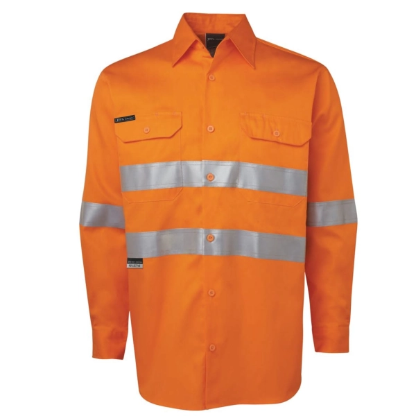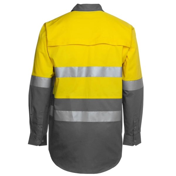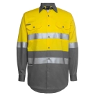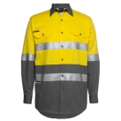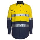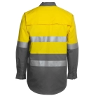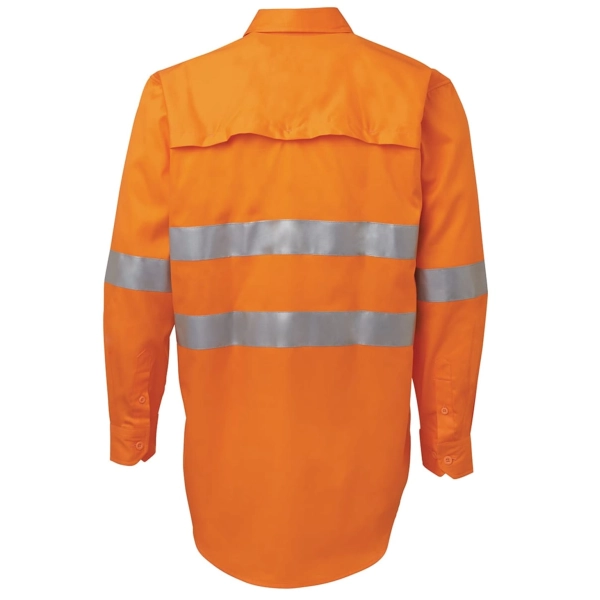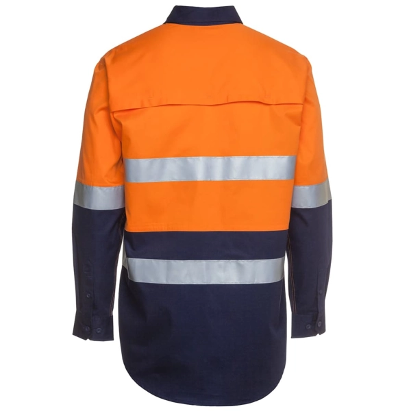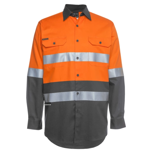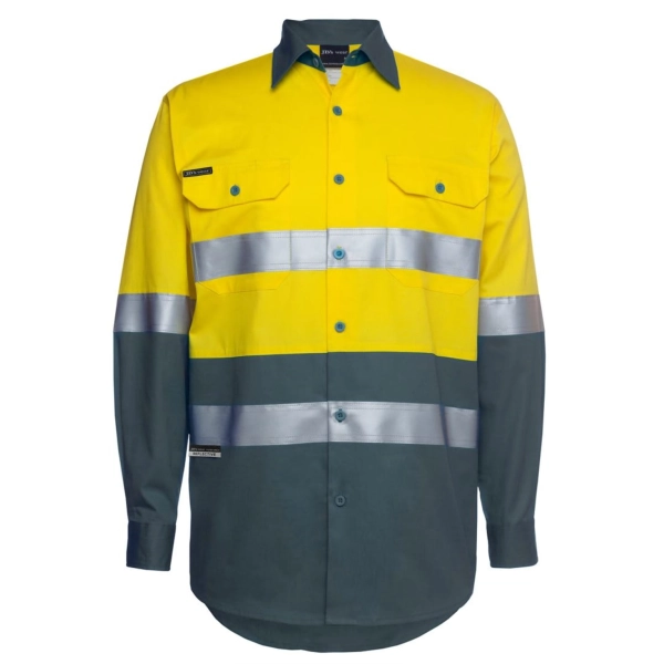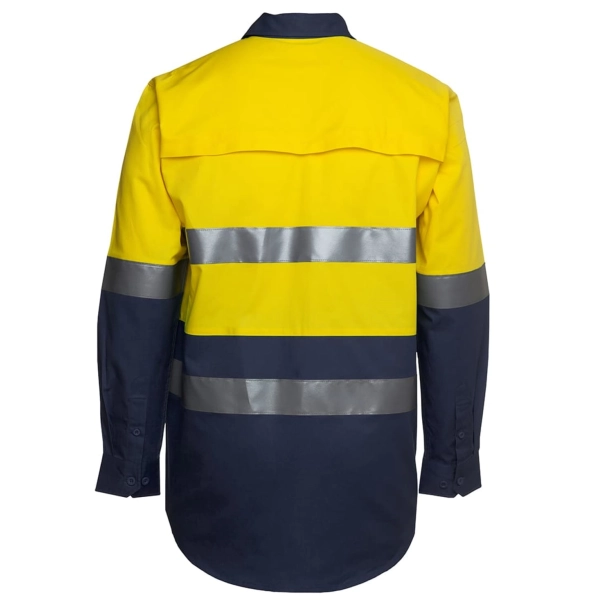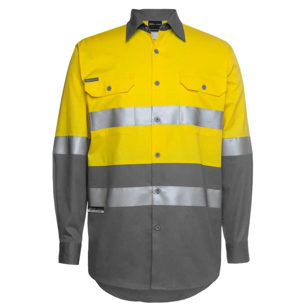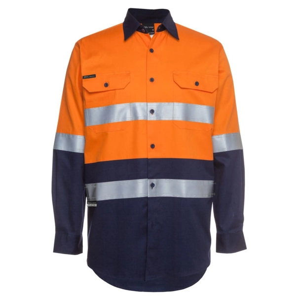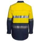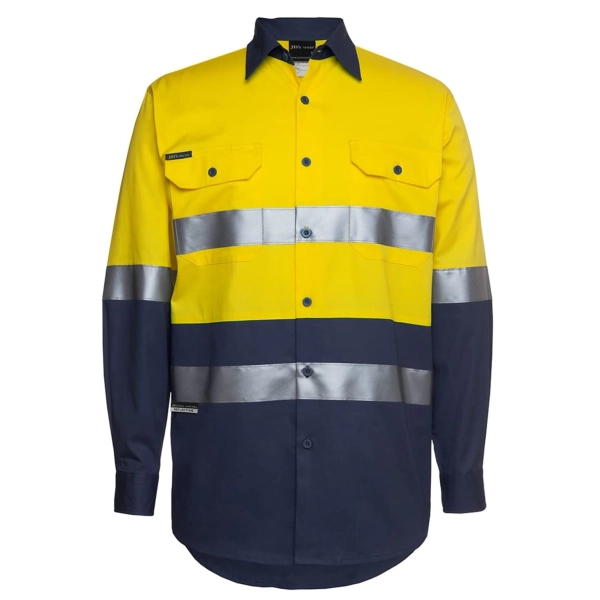 Classic fit | 100% Cotton for 100% comfort in a 150gsm double pre-shrunk drill | Complies with Standard AS 4399:2020 for UPF Protection | JB's reflective tape stands up to 50 times domestic wash | Wide back neck yoke with concealed mesh, cooling gusset at underarms | Complies with Standards AS/NZS 1906.4:2010 and AS/NZS 4602.1:2011 Day and Night | Two front pockets with button-down flaps and pen insert | Curved hem with back tail styling | All pressure points bar tacked for extra strength and durability | 8/9XL only in Yellow/Navy, Orange/Navy, Yellow/Black & Orange/Black