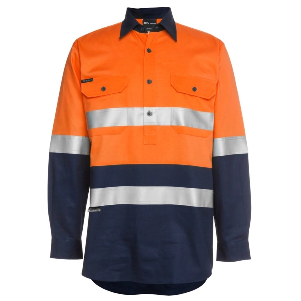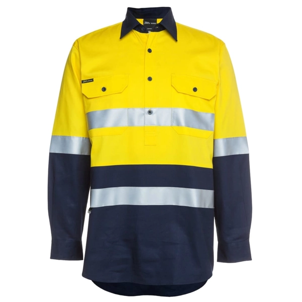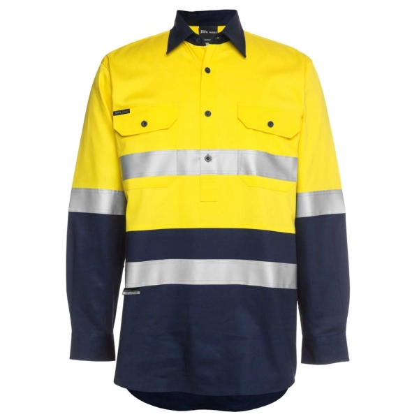 Classic fit | 100% Cotton for 100% comfort in a 190gsm double pre-shrunk drill | JB's reflective tape stands up to 50 times domestic wash | Complies with Standard AS 4399:2020 for UPF Protection (UPF 50+) | Complies with Standards AS/NZS 1906.4:2010 and AS/NZS 4602.1:2011 Day and Night | Two front pockets with button-down flaps and pen insert | Curved hem with back tail styling | All pressure points bar tacked for extra strength and durability | Two-piece collar