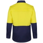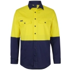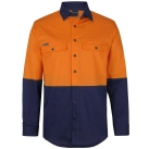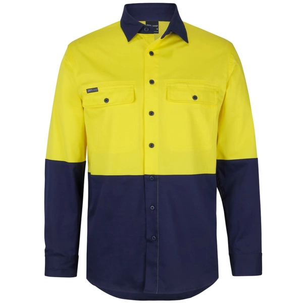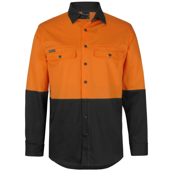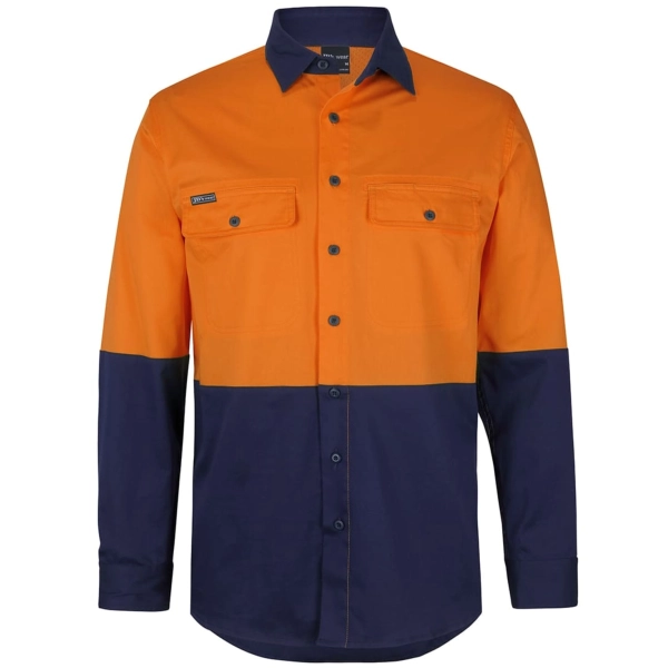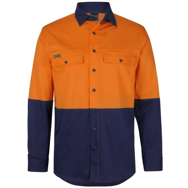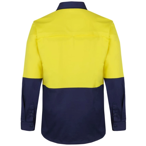 Urban fit | 98% Cotton, and 2% Elastane – 150gsm twill | Complies with Standard AS 4399:2020 for UPF Protection (UPF 50+) | Complies with standard AS/NZS 1906.4:2010 and AS/NZS 4602.1:2011 Day only | Wide back yoke with concealed mesh, cooling gussets at underarms | Front chest pockets with button down flaps and pen insert | Contrast panel on front, lower back and sleeve | Curved hem with back tail styling | Two piece collar