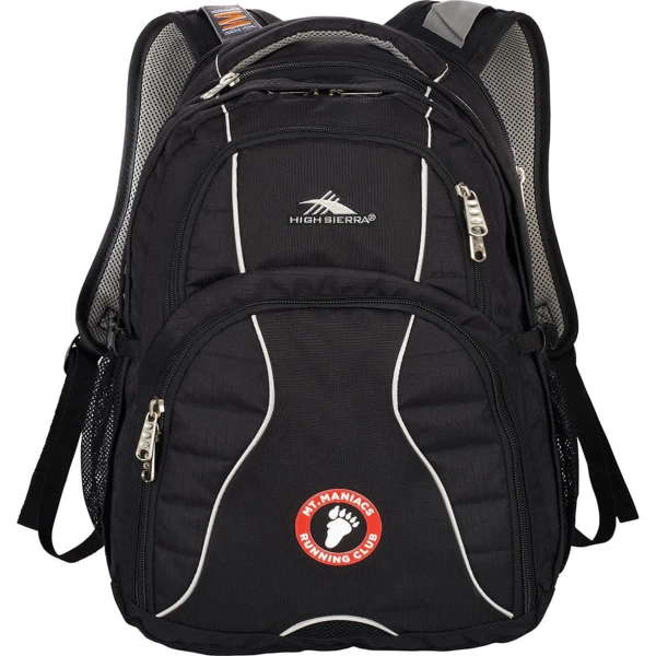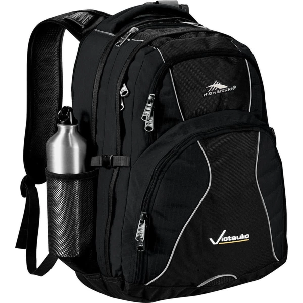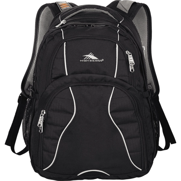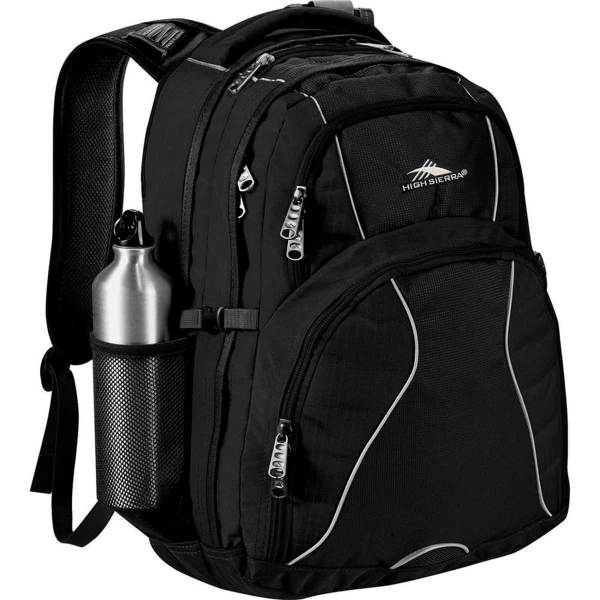 Padded interior computer sleeve holds a 17 inch laptop with easy back-access zipper. Organiser compartment with multiple pockets, zippered mesh pocket and a key fob.