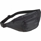 Zippered main compartment. Zippered front pocket. Hidden zippered pocket on rear. Adjustable waist strap with buckle for putting on.