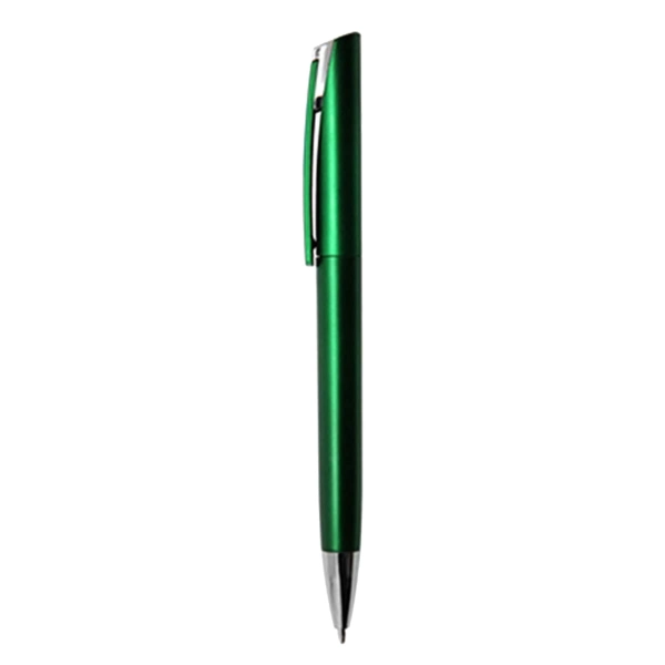 A quality plastic pen designed by European designer twist action with silver chromed tip and clip joint metallic coloured solid plastic barrel high quality German manufactured black ink refill 1800 meters writing distance tungsten carbide ball provides you with quality writing.