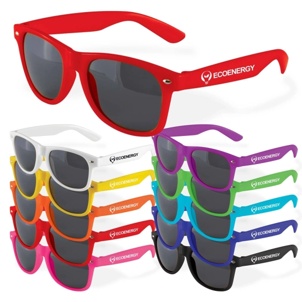 Classic style sunglasses with tinted lenses rated to UV400 providing UVA and UVB protection. Strong polycarbonate frames and lenses are durable and offer all day comfort. Available in a great range of corporate colours - mix and match for your next event. Comply with Australian standards AS/NZS1067:2016 parts 1 & 2.