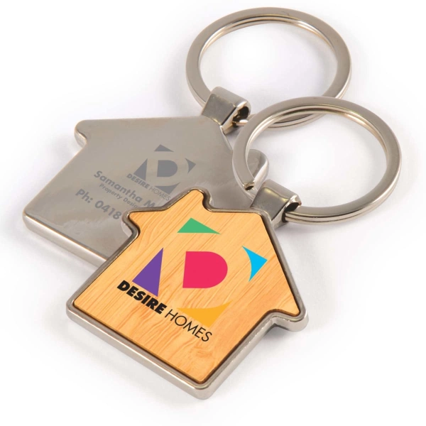House shaped keytag with 32mm split ring. Made from nickel plated cast zinc with a natural bamboo insert.