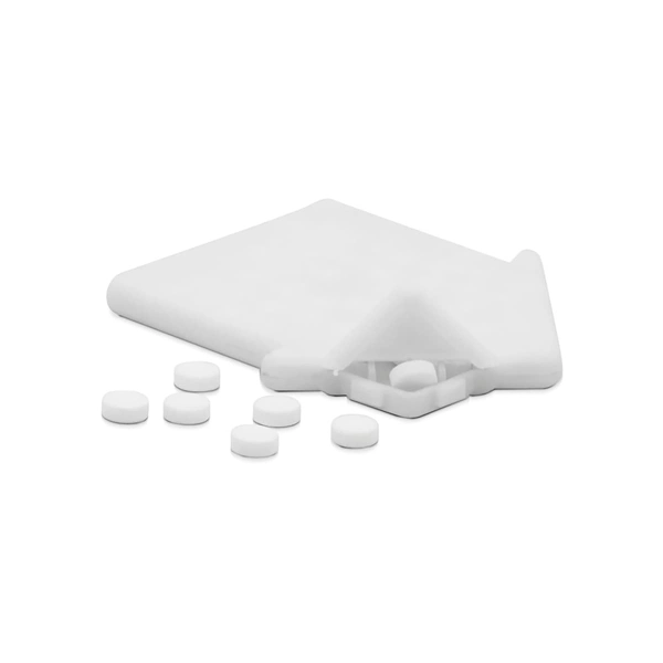 Plastic house shaped mint card filled with sugar free breath freshener mints(approximately 50pcs) and full ingredient and nutritional information is printed on the back of the card.