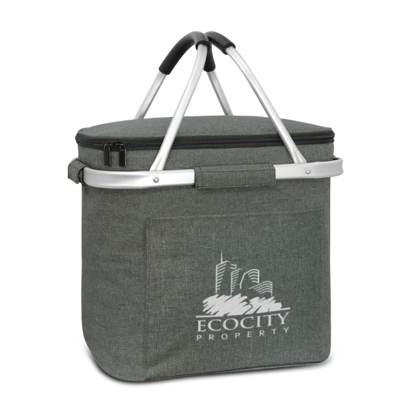 Outstanding large 16L cooler basket with a strong aluminium frame which folds flat when it is not in use. It has PE foam insulation encased in a water-resistant PEVA inner liner and a secure zippered top opening. The outer construction is poly-canvas with an on-trend heather-style finish. Iceland has a handy slip pocket on the front and soft rubber hand grips.