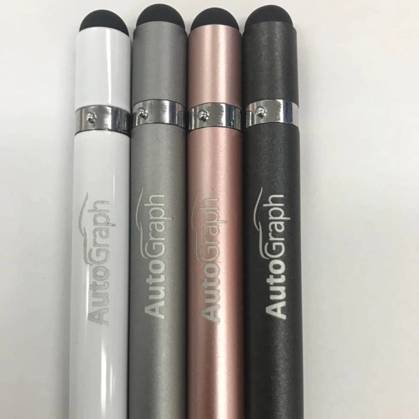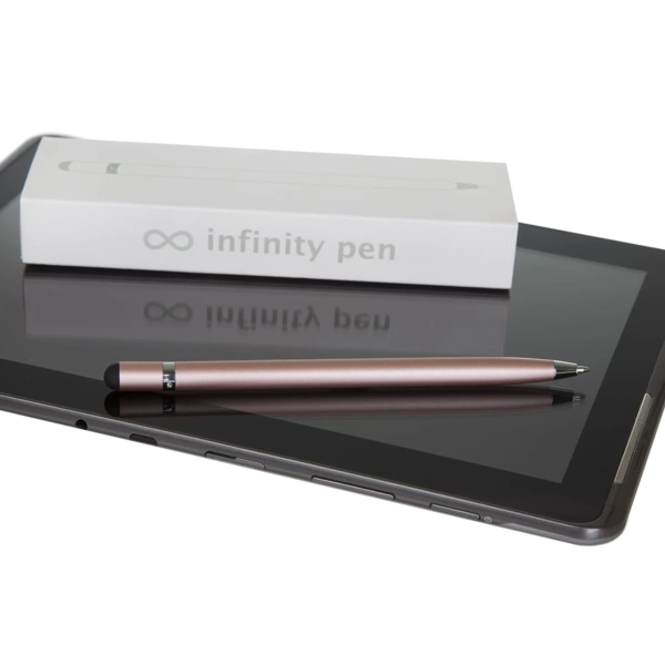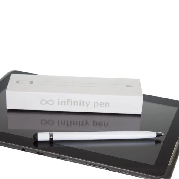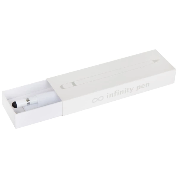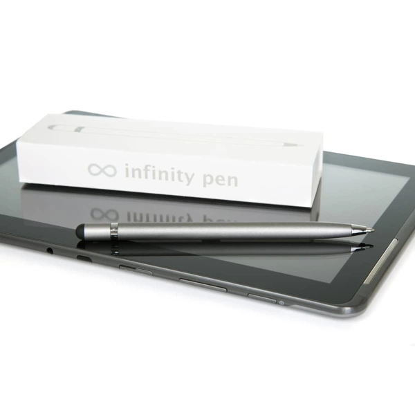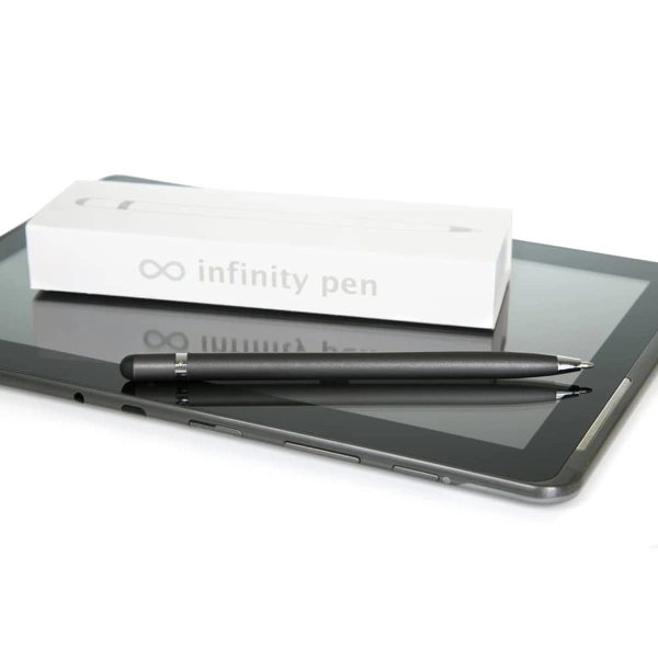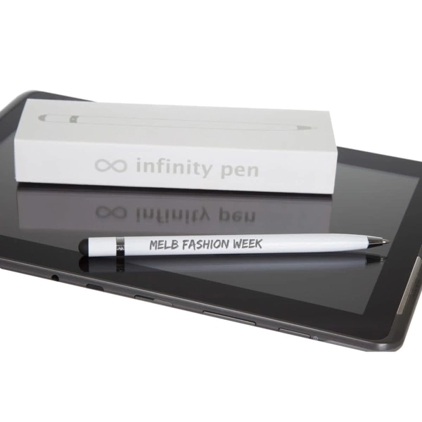 Twist-action pen featuring a sleek aluminium barrel with clean, modern lines. Designed for versatility, it includes a stylus tip for use with tablets and smartphones. Equipped with a high-quality black German ink refill and a TC ballpoint for a smooth writing experience. Each Infinity Pen is presented in a slide-out white box for a refined touch.