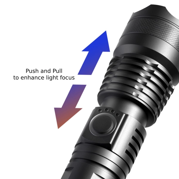 3 Watt black metal torch with bright LED and an push and pull action adjustable beam setting. Presented in a black gift box which can also be printed on. Comes with White USB charging cord and 2200mAh rechargeable battery. AAA batteries not included.
