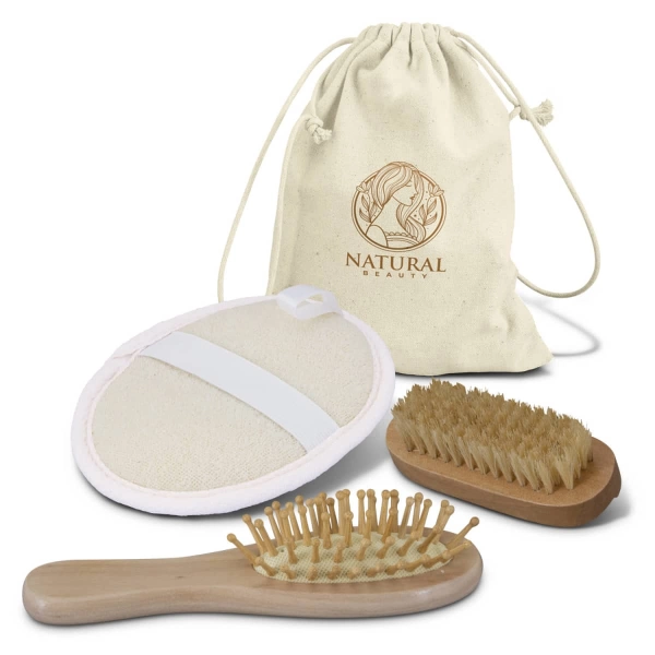 Premium natural bamboo travel set which includes a hairbrush, a nail brush and an exfoliator in a cotton gift bag. Bamboo is a natural material which produces unavoidable variances in the grain pattern colour.