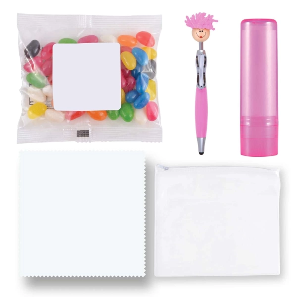 Elevate your promotional efforts with our Intro Pack, a comprehensive selection designed to make a memorable impression. This pack features the quirky Doctor Mop Top Pen with a stylus, a soothing Lip Balm Stick, a handy Microfibre Lens Cloth, and a delightful 50 grams of Jellybeans. All these items are neatly packed in a clear zippered case, making it an excellent choice for giveaways, events, or as a welcome gift. The Intro Pack offers practical items with a touch of fun, ensuring recipients appreciate and remember your brand.