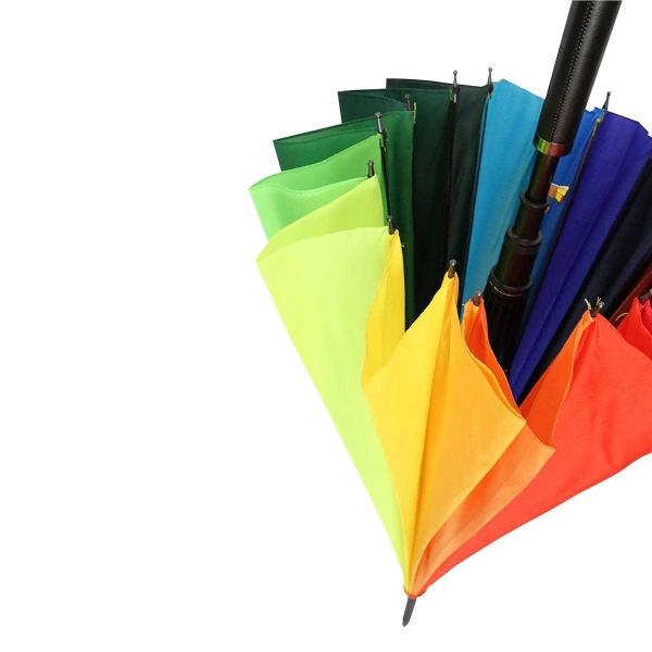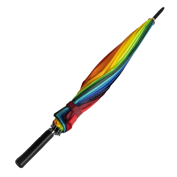 Brighten up any rainy day with the Iris Umbrella! Featuring 16 vibrant shades of the rainbow, this full-sized umbrella not only keeps you dry but also offers the perfect backdrop for showcasing your brand. With a 16-rib fibreglass frame for extra stability, it’s built to withstand even the strongest winds. The durable 190T pongee fabric is tougher and more resilient than traditional nylon or polyester, ensuring long-lasting use. Plus, its sleek black flat-pointed tip and vegan leather handle add a stylish touch. Stay dry and make a statement with the Iris Umbrella!