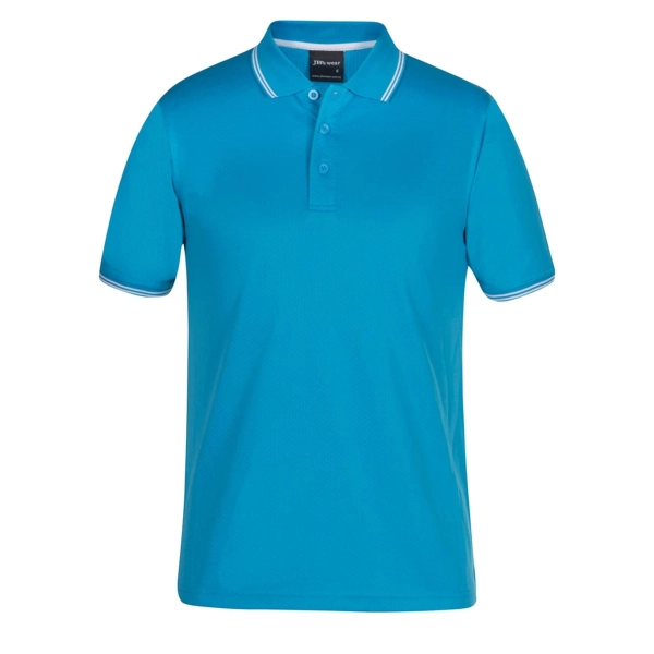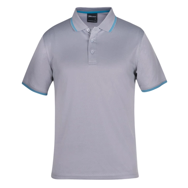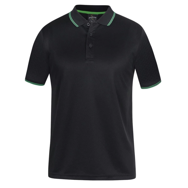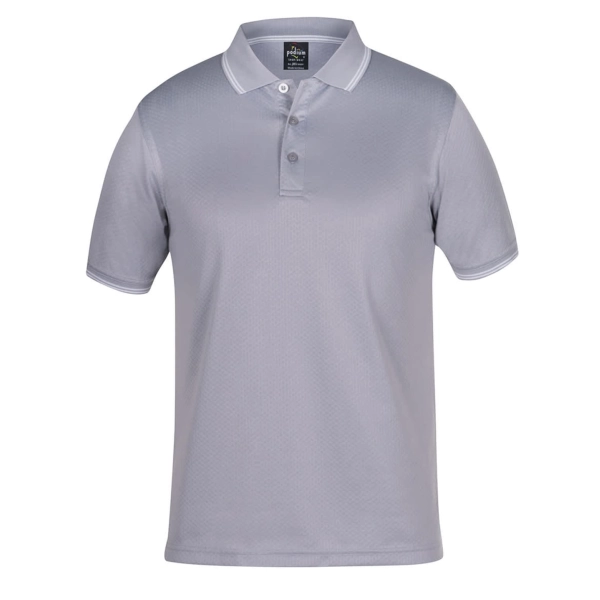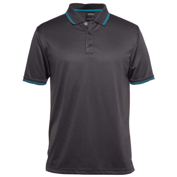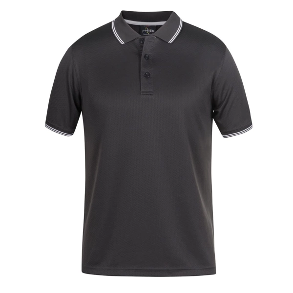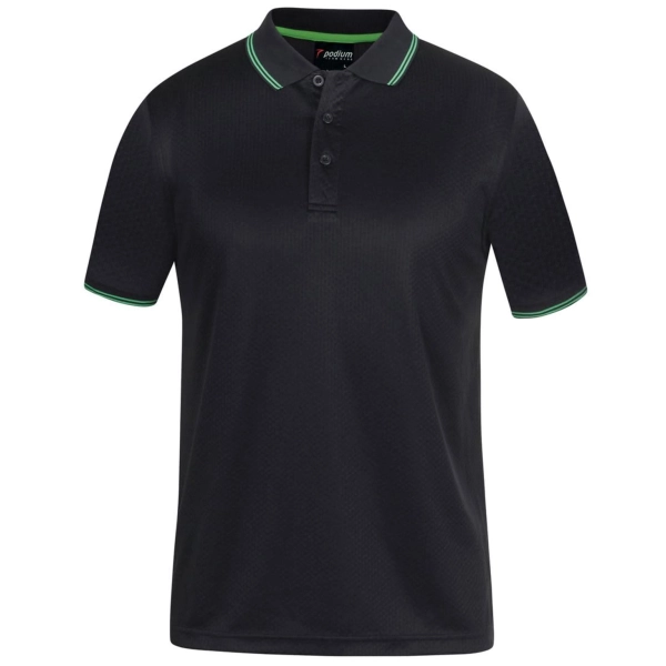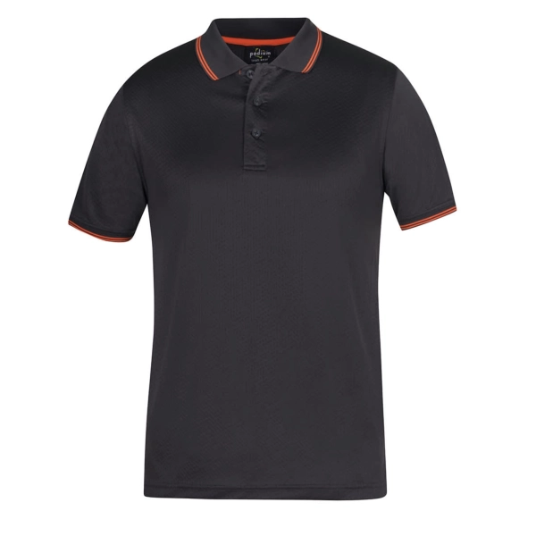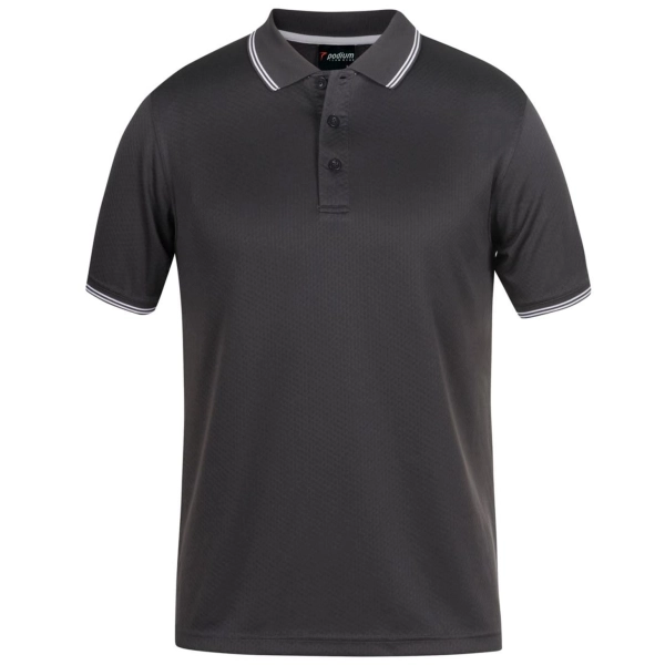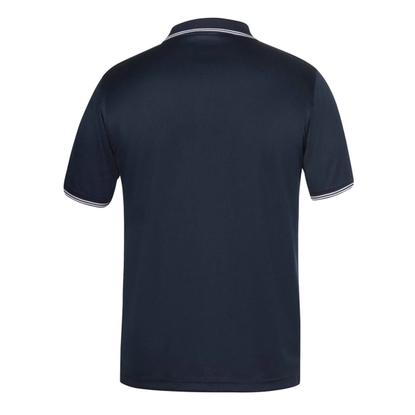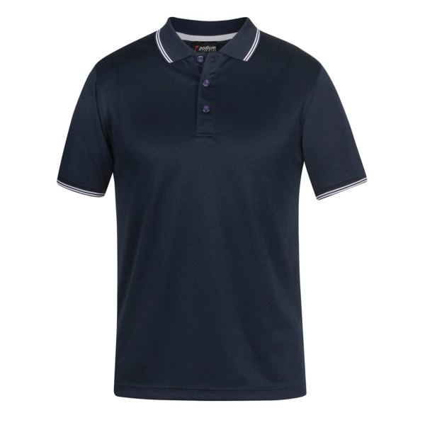 Urban fit | 100% polyester for durability | Jacquard knit 160gsm for increased durability | Podium Cool™ moisture wicking fabric designed to help keep you cool and dry | Contrast colour tipping on collar and sleeve cuff | Dual colour button | Straight hem with side splits | Complies with Standard AS 4399:2020 for UPF Protection | 2XS, XS available in Navy/White