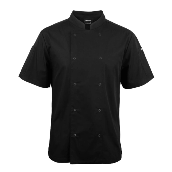 Classic fit | 65% Polyester for durability, and 35% Cotton for comfort | 180gsm light weight | Mesh under arm and back yoke for airflow | Pen pocket on both sleeves | Snap button closure for quick open and closure | Centre back tab for apron strap to go through
