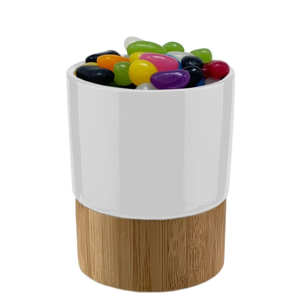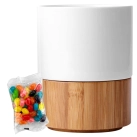A simple and common design 300ml ceramic coffee mug(EK007) comes with 250g(50g/bag x 5) assorted or corporate colour mini Jelly Beans(JB003). It is the combination of ceramic and bamboo which makes the mug distinctive. The bamboo base keeps your hands cool and drinks hot handwashing only and microwave not recommended.