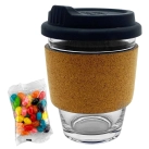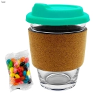 A trendy 340ml reusable glass coffee cup(EK013) which is made of borosilicate glass comes with a bag of 50g assorted or corporate colour mini Jelly Beans(JB003). The cup has a heat-resistant cork band and push on silicone lid the lid is made of European standard silicone material in 13 standard colours. It is presented in a cardboard box with a window you can also select the gift tube to pack the cup and have your logo printed on the tube. This cup is not dishwasher safe and handwashing is recommended. Note the silicone lid is not recyclable material.