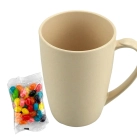 Eco-friendly 350ml single walled reusable bamboo coffee cup(EK005) comes with 300g(50g/bag x 6) assorted or corporate colour mini Jelly Beans(JB003). It is made from a blend of natural organic bamboo fibre and Polypropylene. Renewable and biodegradable. The use of disposable plastic cups is no longer recommended as it pollutes the environment. This cup is strong durable and anti-bacteria it is BPA and phthalate free. This product is dishwasher safe but microwave is not recommended.
