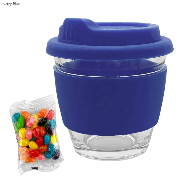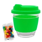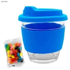 A trendy 250ml reusable glass coffee cup(EK014) which is made of borosilicate glass comes with a bag of 50g assorted or corporate colour mini Jelly Beans(JB003). The cup has a heat-resistant silicone band and push on silicone lid they are made of European standard silicone material in 13 standard colours can be mixed and matched in any colour combination. It is presented in a cardboard box with a window you can also select the gift tube to pack the cup and have your logo printed on the tube. This cup is not dishwasher safe and handwashing is recommended. Note the silicone band/lid is not recyclable material.