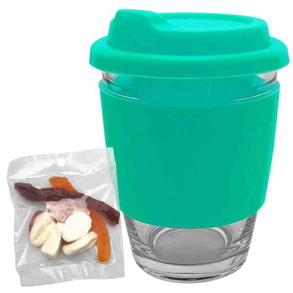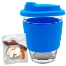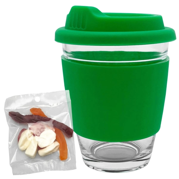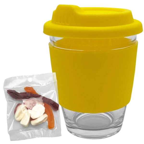 A trendy 340ml reusable glass coffee cup(EK012) which is made of borosilicate glass comes with a bag of 50g assorted Cadbury Fresha jelly party mix(PM001) the contents of each bag may vary. The cup has a wide printing area heat-resistant silicone band and push on silicone lid they are made of European standard silicone material in 13 standard colours can be mixed and matched in any colour combination. It is presented in a cardboard box with a window you can also select the gift tube to pack the cup and have your logo printed on the tube. This cup is not dishwasher safe and handwashing is recommended. Note the silicone band/lid is not recyclable material.