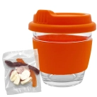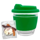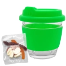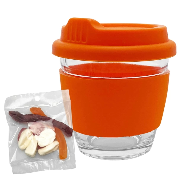 A trendy 250ml reusable glass coffee cup(EK014) which is made of borosilicate glass comes with a bag of 50g assorted Cadbury Fresha jelly party mix(PM001) the contents of each bag may vary. The cup has a heat-resistant silicone band and push on silicone lid they are made of European standard silicone material in 13 standard colours can be mixed and matched in any colour combination. It is presented in a cardboard box with a window you can also select the gift tube to pack the cup and have your logo printed on the tube. This cup is not dishwasher safe and handwashing is recommended. Note the silicone band/lid is not recyclable material.
