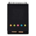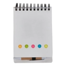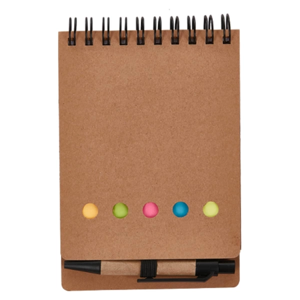 A spiral bound multi-purpose note pad has a 60 leaves(120 pages) lined note pad a 25 leaves yellow adhesive note pad five different coloured paper pads of adhesive flags (orange green pink blue yellow) and a recycled cardboard barrel pen slips into the elastic retaining closure. Unbleached natural cardboard cover. A very handy notebook and note pad for office staff and students.