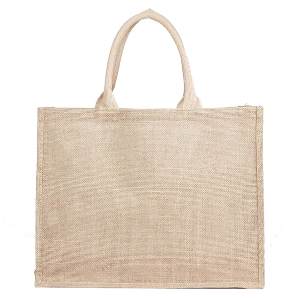 High quality environmentally friendly large laminated jute shopping bag in natural colour with padded cotton handles and seamed edges. A great promotional bag for your event.