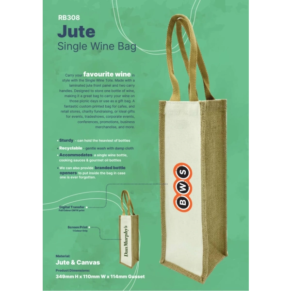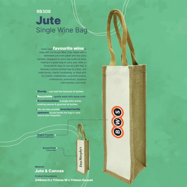 Every Jute Single Wine Bag does more than carry a bottle – it helps plant a tree. With each one sold, a donation is made toward reforestation efforts, giving us greener spaces and fresher air. It’s a feel-good promo with a serious impact. Designed to showcase your logo or message front and centre, this bag is a smart pick for brands wanting to make an impression and a difference.