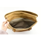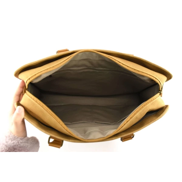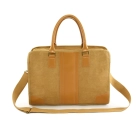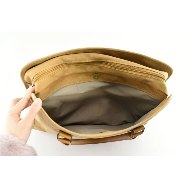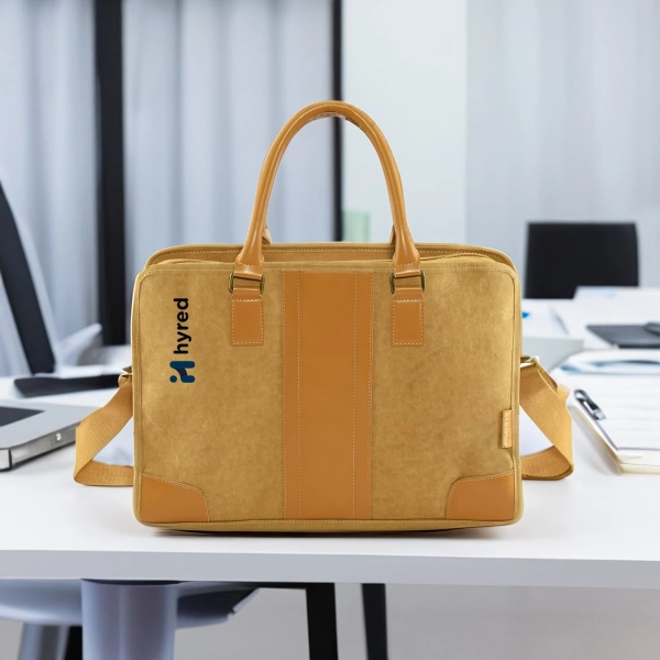 Karlo Kraft Paper Conference Satchel combines durability functionality and style making it a suitable companion for professionals. The use of German 0.55mm washable kraft paper and brown PU materials gives it a unique and modern look. The various closure mechanisms including the gold metal magnet buckles and the brown polyester zipper offer both security and elegance. The addition of interior pockets allows for organized storage of belongings making it a practical and stylish choice for work-related needs. Additionally the luggage case strap provides added convenience for travellers or those who need to carry the bag alongside other luggage. It has PU webbing handle one zipper pocket and two open pockets inside the bag.