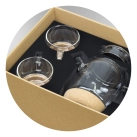 Stylish tea set that comes with a 800ml tea pot and two 250ml glass mugs. Manufactured from double wall borosilicate glass with a natural cork base, making the set durable with heat insulation properties. The set is presented in a natural gift box with a branded black sleeve.