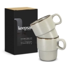 Set of two rustic 350ml stackable ceramic mugs. Featuring a unique mottled glaze and metallic rim detail, the stackable design makes for convenient, easy storage - perfect for any kitchen or office. Beautifully presented in a natural kraft gift box with a Keepsake branded sleeve.