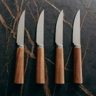 Premium set of four steak knives fitted with durable acacia wooden handles and sharp stainless steel knife blades. The steak knife set is presented in a natural gift box with a branded black sleeve.