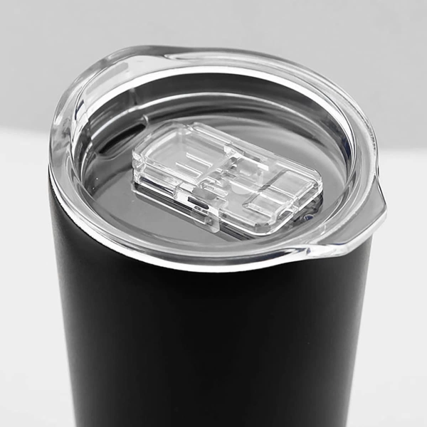 600ml capacity mug double walled and vacuum insulated it has a clear plastic lid with splashproof push-seal closure made of 304 grade stainless steel. Gloss painted exterior and electrolysis interior BPA free cannot be microwaved and hand wash only.