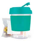 320ml clear reusable Kick coffee cup. Includes heat resistant silicone sleeve and screw on lid. Includes 50 grams bag of jelly beans. Select your choice of lid and silicone sleeve colours. BPA free. For logo longevity hand washing is recommended. Eco Credentials: Reusable, sustainable, printed using renewable energy.