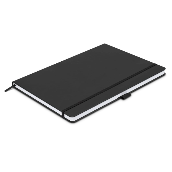 A large-size (approximately A4) notebook that has a hardcover with a smart PU finish. It has 96 sheets (192 pages) of 70gsm lined paper, a bookmark ribbon, an elastic closure band and an elastic pen loop.